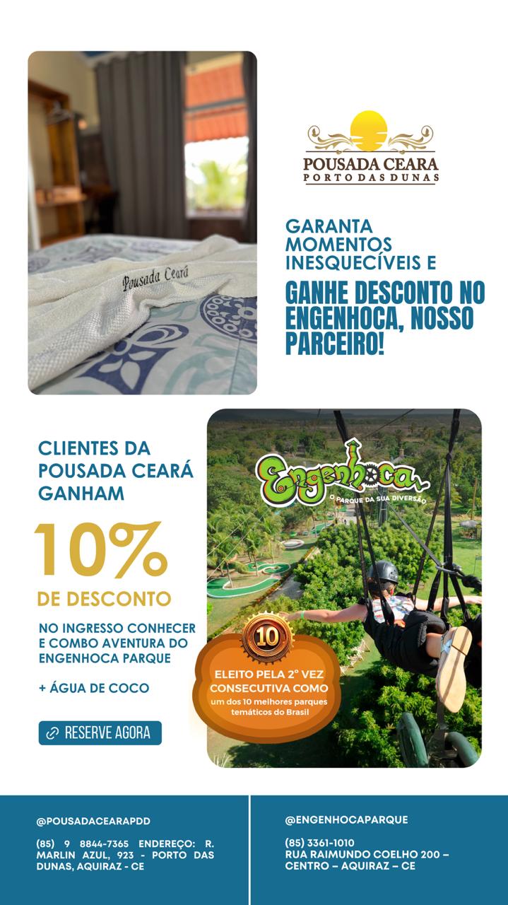 Ao se hospedar na Pousada Ceará, você recebe um cupom exclusivo para aproveitar 10% de desconto na Entrada Aventura e na Entrada Conhecer do Engenhoca Parque, além de 1 água de coco por pessoa, como cortesia especial para nossos hóspedes.